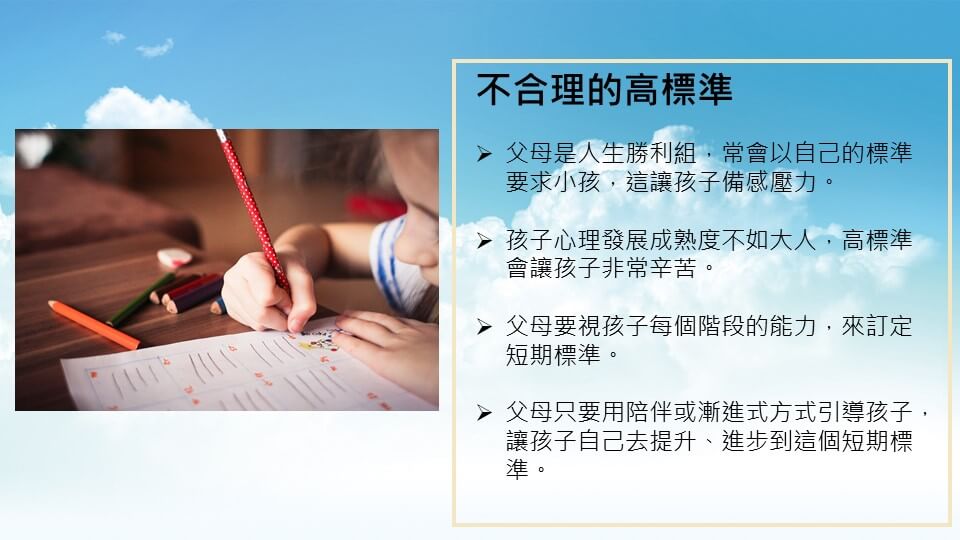 請你們視孩子每個階段的能力,來訂定短期的標準,再用陪伴或漸進式的方式去引導孩子,讓孩子自己去提升、進步到這個短期的標準。