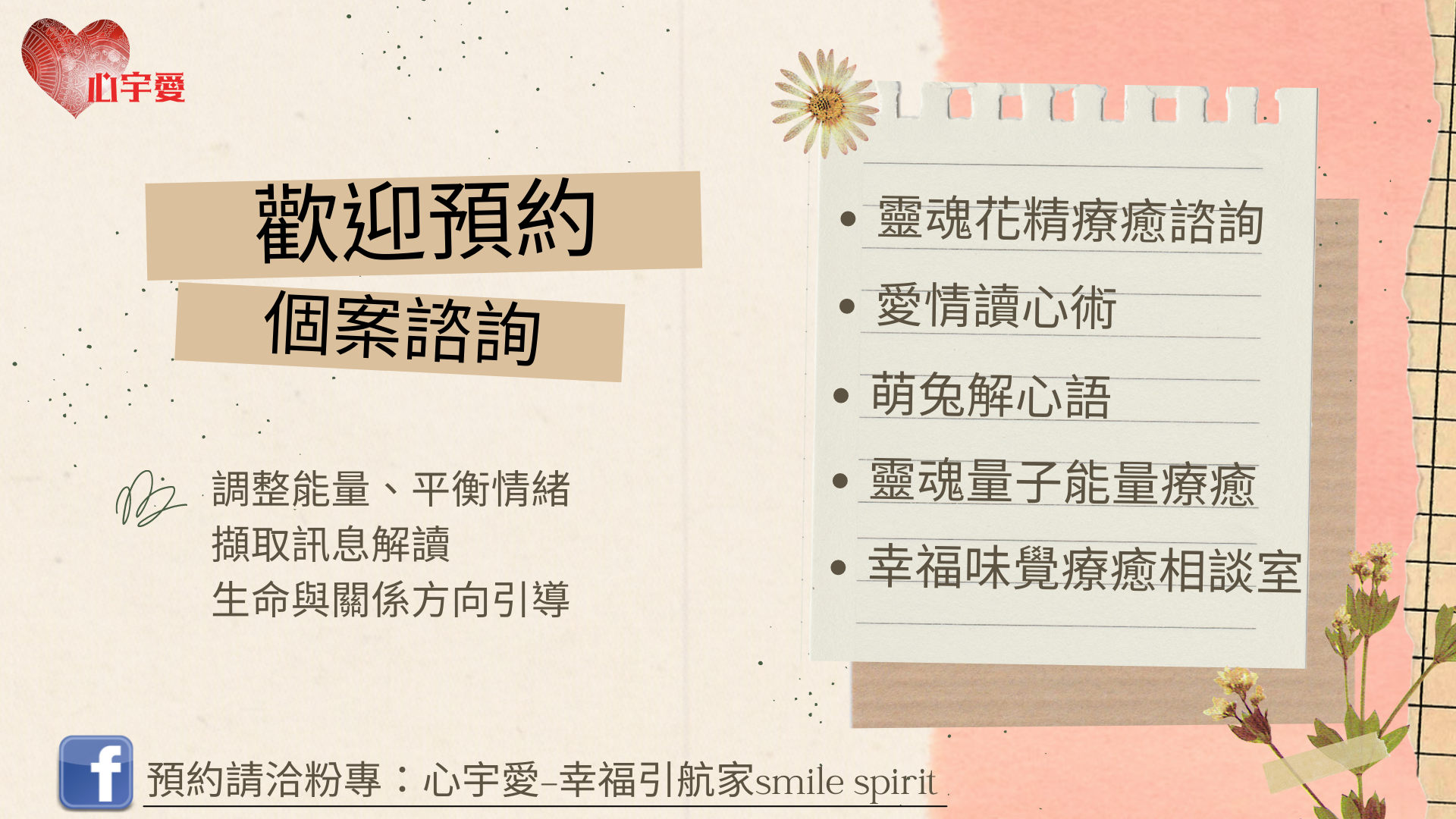 針對能量平衡、訊息解讀、靈魂花精、幸福療癒…等等,提供諮詢服務。