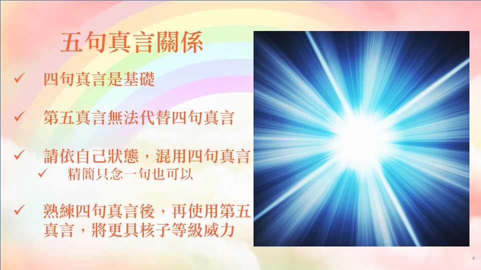 這第五句話之所以重要,就是他發現這句話是具有核子、核爆等級的清理真言,但這並不代表前面四句話不重要,而是都可以搭配著使用。