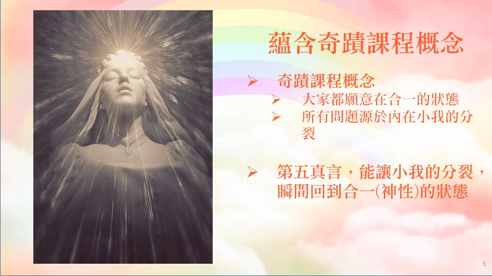 奇蹟課程的概念,就是我們大家都願意在一個合一的那個狀態,而所有的問題是來自於我們內在那個我的分裂。