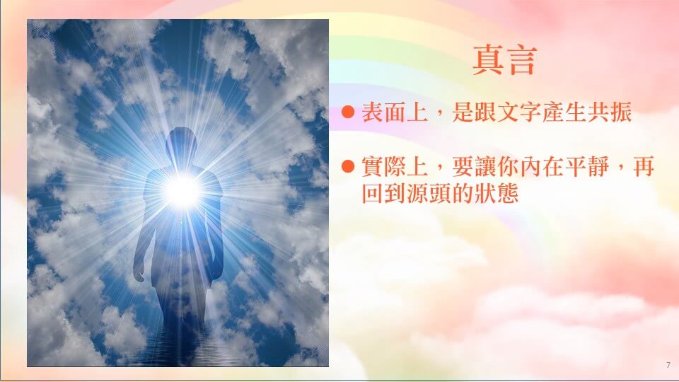 真言的意思,就像我們在讀佛經或聖經之類的經典,當你在閱讀它的時候,其實我們表面意思好像是在跟這些文字去共振,但實際上,它是要讓你的內在有平靜感,然後回到最原始的那個源頭的狀態。
