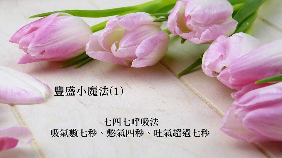 我書中有介紹一個小魔法,就是七四七的呼吸法。美國那邊他們研究這個呼吸法,對我們的一些轉化、提升有很快速的效果,也就是吸氣數七秒、憋氣四秒、吐氣要超過七秒。
