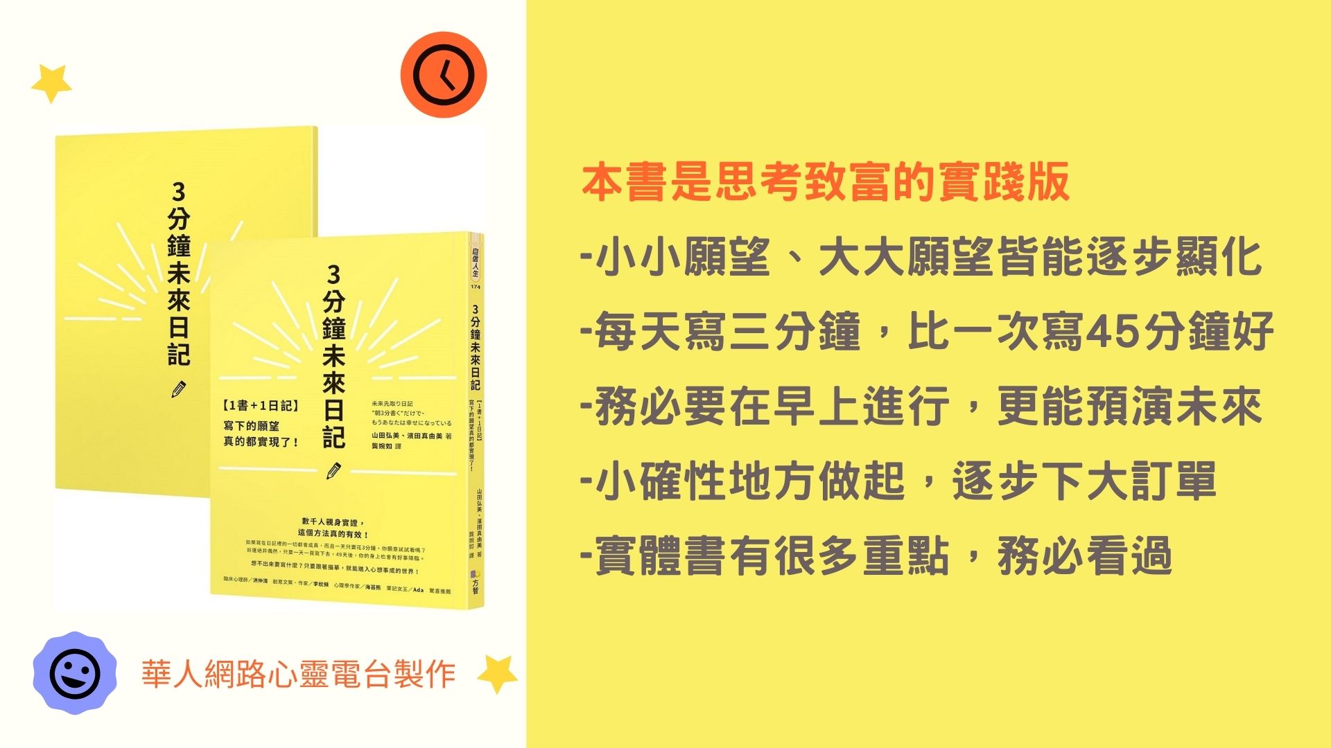 如果要求我們自己每天要寫45分鐘的話,可能沒有這個耐心,3分鐘就可以書寫的未來日記比較好執行,而且一定要在早上進行,就是可以幫我們預演未來