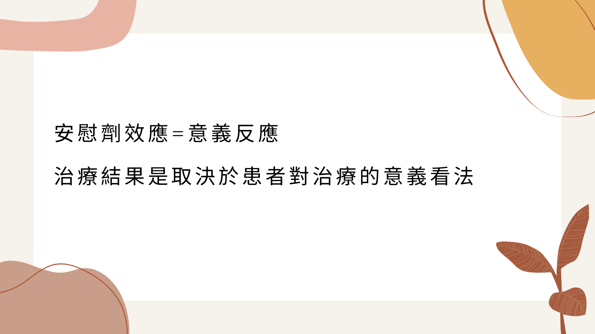 有一位教授丹尼爾.摩爾曼,他將許多安慰劑效應稱為「意義反應」,因為很多治療結果是取決於患者對治療的意義看法。