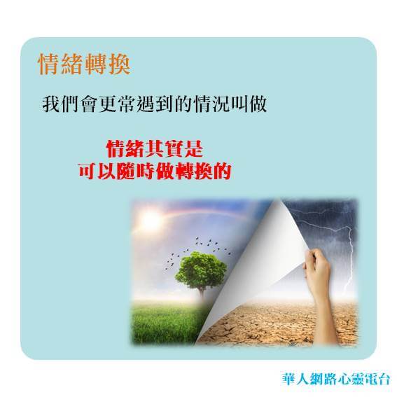 所以當腦海裡出現盲人拿著導盲杖不小心撞到了我們 的這個畫面,這樣子的一個心靈影像出現的時候,它就會提醒我們:當你情緒要爆發的時候,其實隨時都有轉換的空間。你隨時可以決定自己的情緒要怎麼樣。