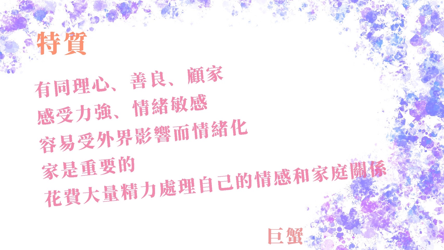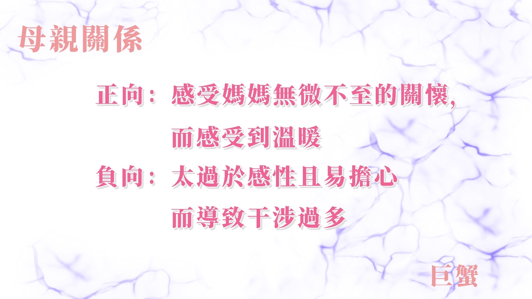 後來我聽說幾位朋友的母親是巨蟹座,同樣也有掌控欲,而他們的母親總希望家人能把自己放第一位,如果一個不小心忽略了,母親就會傷心很久。