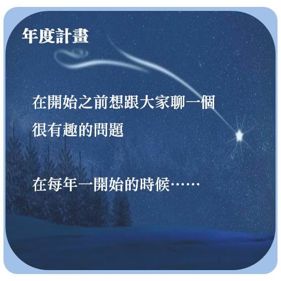 很多人通常就是訂了很多計畫,然後到了年底的時候,有一堆都還沒有做到,他們的目標都沒有達成。