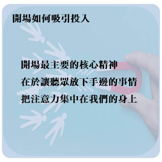 如何開場才能吸睛? 就是要讓觀眾放下手邊的事情,把注意力集中在我們的身上。