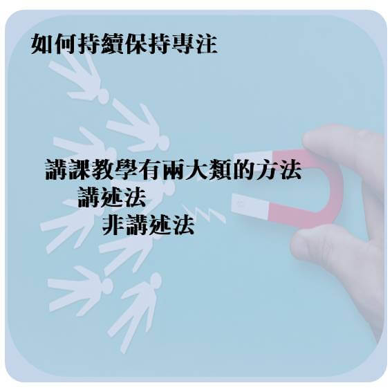 還有一個,如果因為各種因素我們只能用講述的方法,例如說像是內容很多,但是時間很有限,就是時間很趕的情況之下,我們可以怎麼樣在只有講述法的情形下,讓學員能夠更加的專注或集中呢?