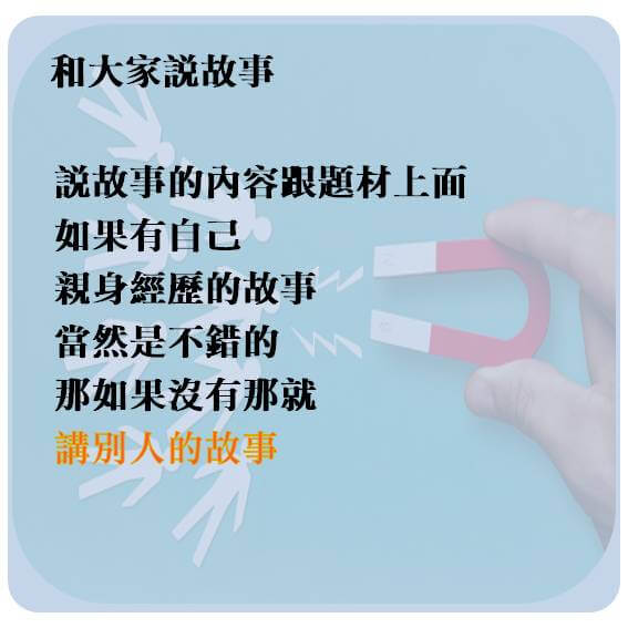 當然在說故事的內容跟題材上面,如果你有自己親身經歷的故事的話,這個當然是相當不錯的。