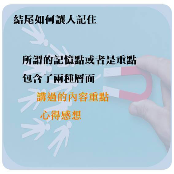 結尾最重要的,就是要讓聽眾或者是學員記得我們講的一些內容,至少有一個到三個記憶點,這樣就非常夠了。