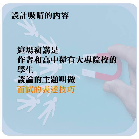 這場演講是作者在和高中還有大專院校的學生,談論的主題叫做面試的表達技巧。