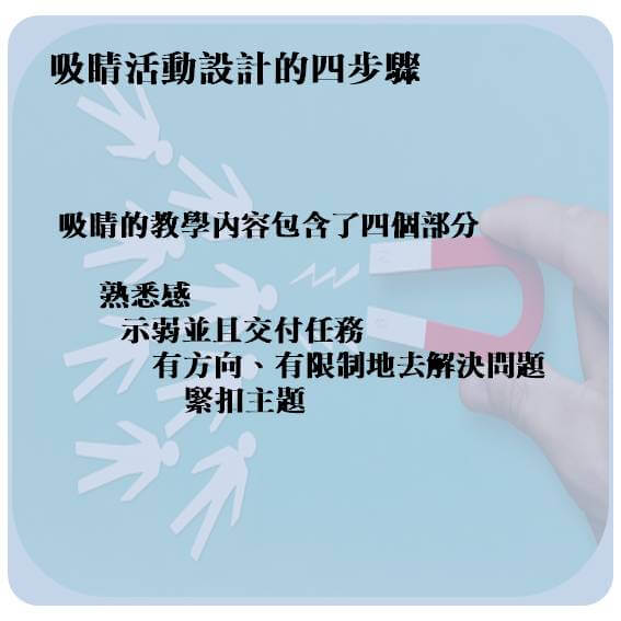 如果一堂課程是50分鐘左右的話,可以走兩段18+5的過程。所以請特別留意一件事情:吸睛活動它只能是配角,而我們應該把光環聚焦在主題上。