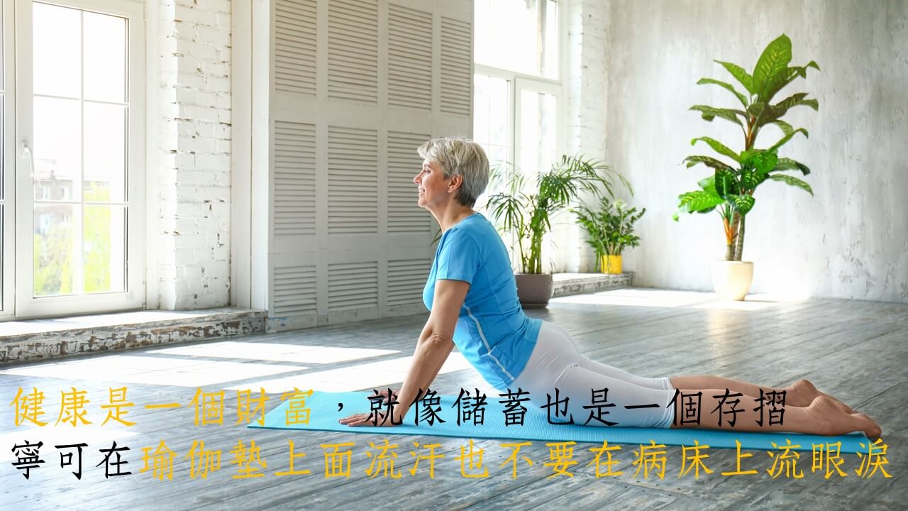 我覺得健康是一個財富,就像儲蓄也是一個存摺,那你越早投資你的健康,寧可在瑜伽墊上面流汗也不要在病床上流眼淚