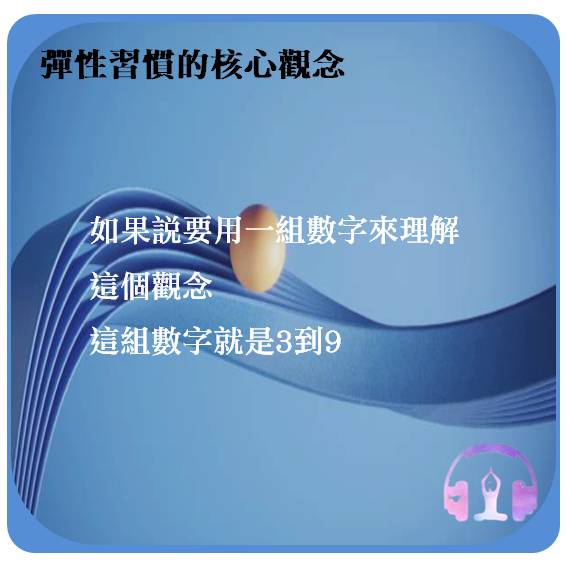 彈性習慣的最核心的觀念究竟是什麼? 在這裡我想跟各位分享這一本書最大的一個觀念---如果說我們要用一個數字來理解這個觀念,這一組數字就是3到9,這是什麼樣子的意思呢?
