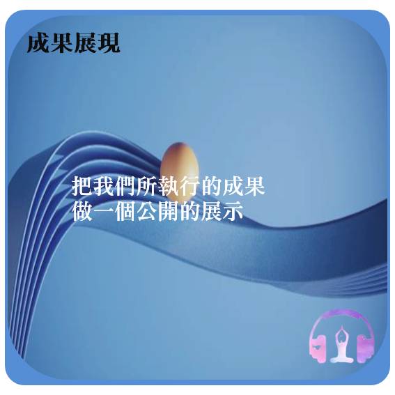 第五個步驟叫做把我們所執行的成果做一個公開的展示。像現在有FB、有IG,甚至有你的群組……等等的都很方便,我們可以透過各種方式,例如文字、例如照片甚至影片的方式去做呈現。