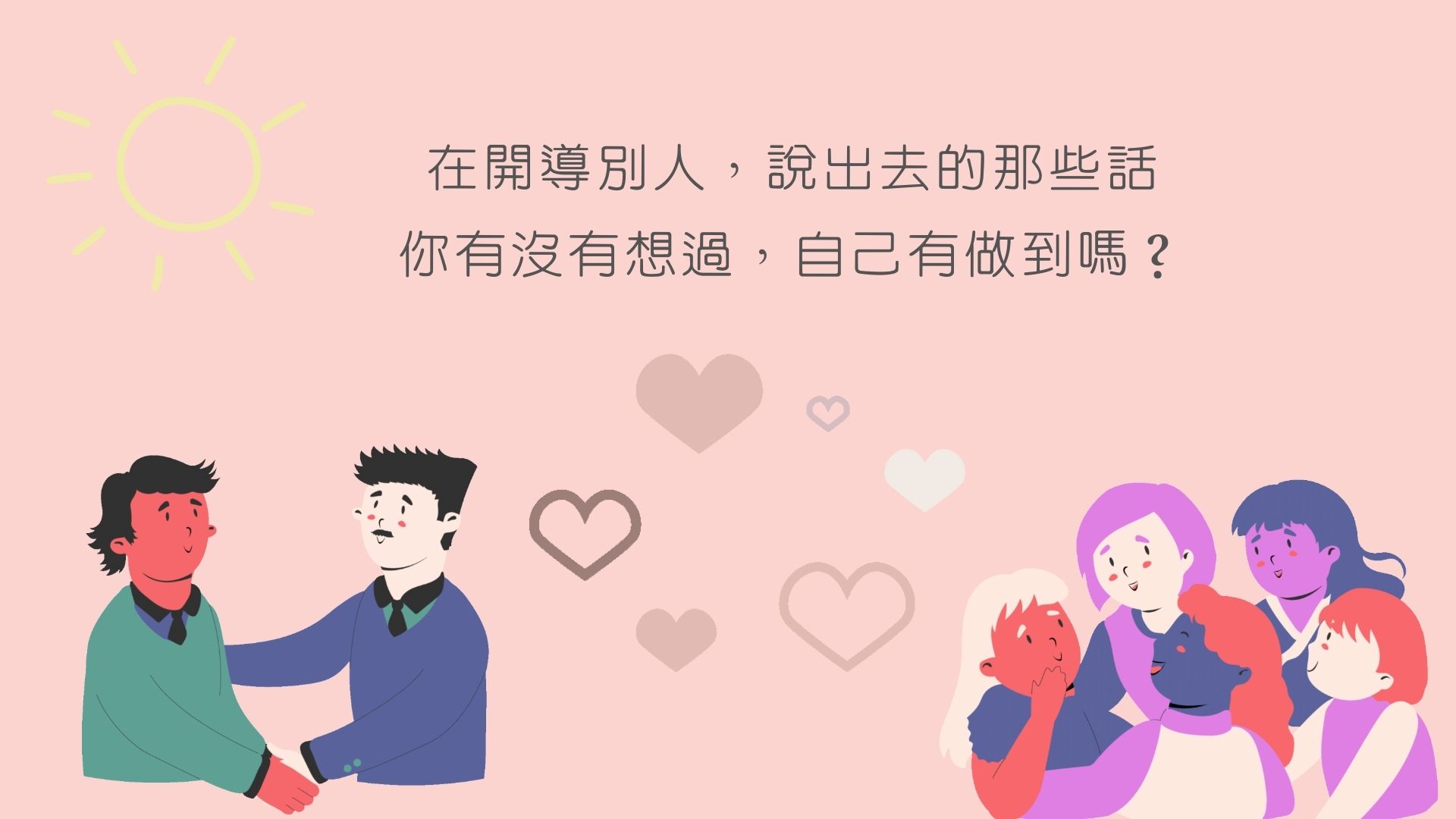 其實你意識到每個人都是自己的時候,在開導別人,說出去的那些話,你有沒有想過,自己有做到嗎?論語裡提到的吾日三省吾身,就是每天不斷的自省,學習人生課題。