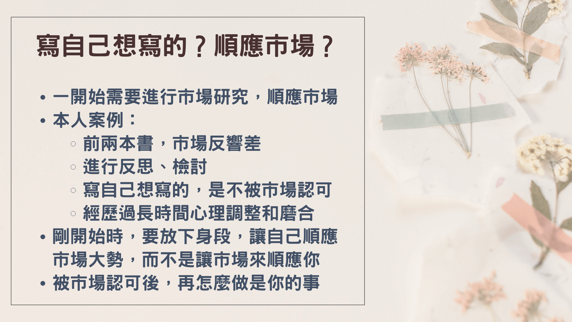 我個人覺得,還是應該要順應市場的需求,我們寫東西,不能曲高和寡。