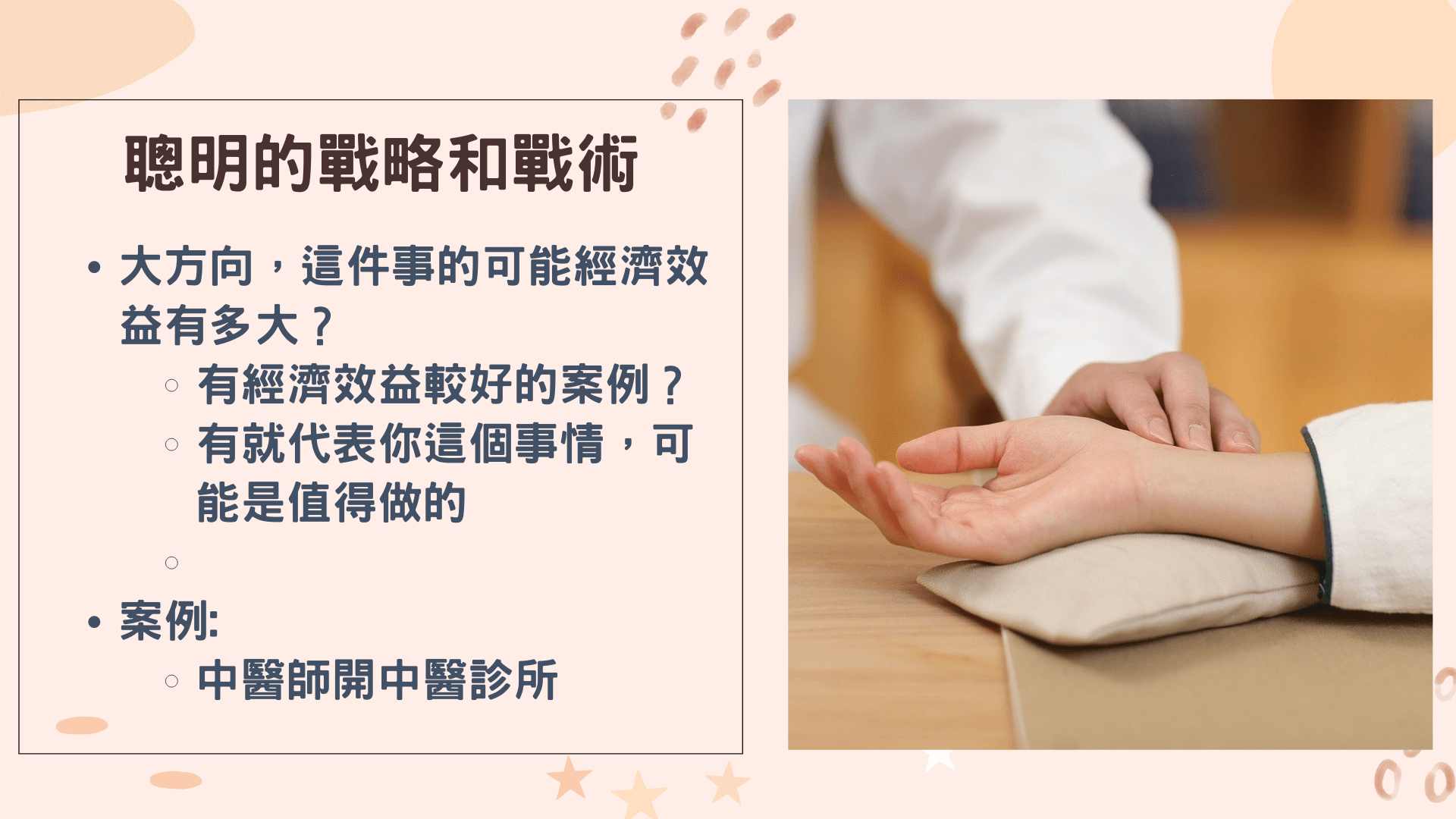 我舉個簡單的例子,我曾經給一個人做過創業諮詢,當時他是中醫師,他開了個中醫診所,但他不是單純開中醫診所,因為他覺得中醫診所的競爭太激烈了。但我們知道,這行業競爭激烈歸競爭激烈,不過當中賺錢的,是特別賺錢。