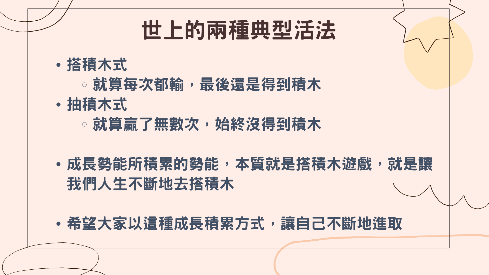 如果是玩抽積木的遊戲,就算是贏了無數次,但始終是沒有得到一個積木。所以,當你玩抽積木遊戲的時候,你永遠是輸,你的最終結局,只可能是輸。但是,如果你是玩搭積木遊戲,就算你每次都輸,你最後還是得到那些東西。