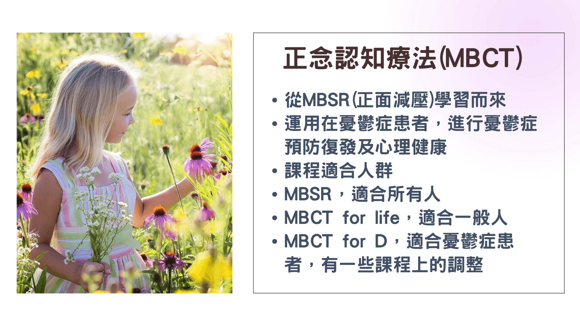 MBSR是所有人都很適合,原則上大家都可以去上的課,那MBCT的話,現在也發展出MBCT for life,就是給一般人上的課,或者是深化的課。