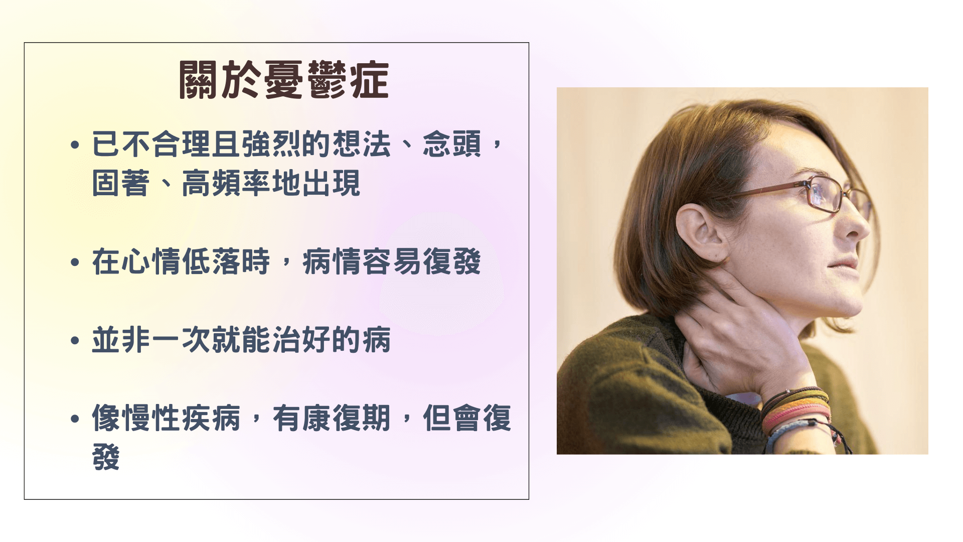其實像憂鬱症來說,我們會有一些已經是不合理、比較強烈的想法、念頭,比較固著、高頻率地出現了,它其實會造成我們很多在情緒低落時,病情很容易復發。