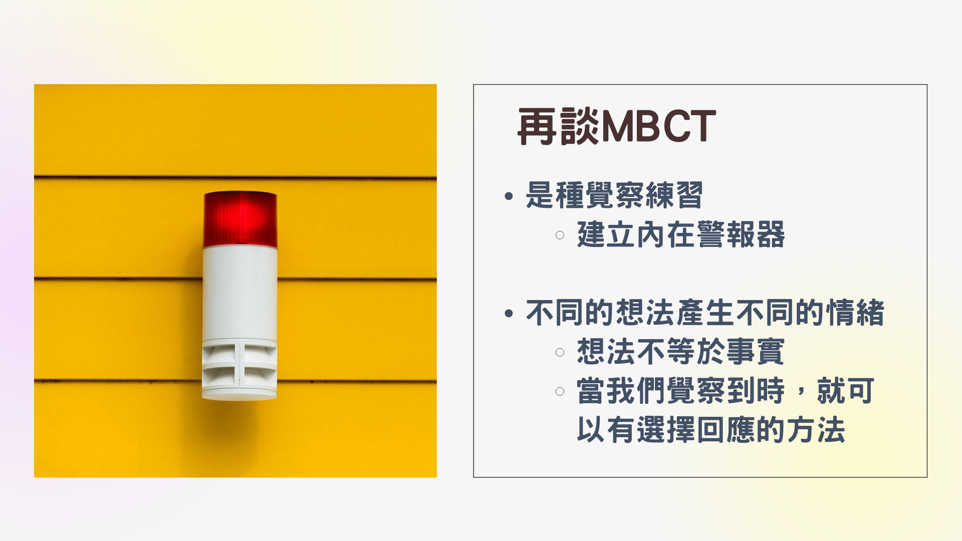 聽起來,好像MBCT馬上可以幫助我們,去建立一個關於自己內在的警報器。就像我現在覺得心情不是那麽好、現在沒有那麽想要工作或怎樣子的感覺時,警報器就馬上發出聲響。