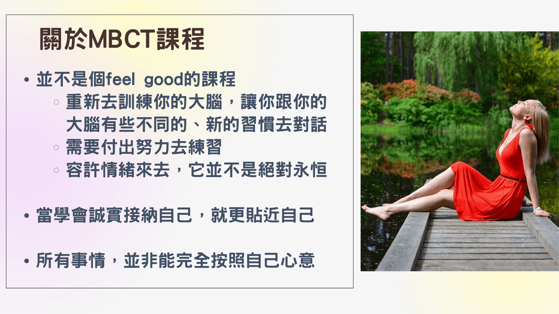 MBCT並不是一個feel good的課程,因為要重新訓練你的大腦,跟你的大腦有一些不同的、新的習慣的對話,所以其實是需要付出一些努力跟練習。