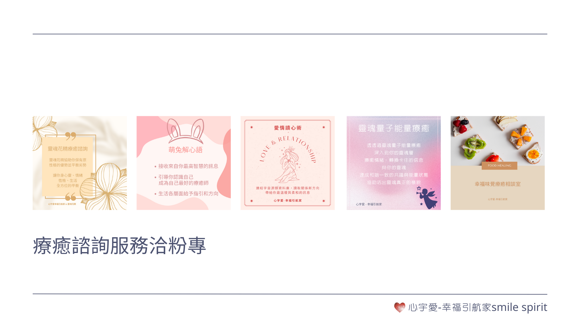 透過靈魂花精、愛情讀心術、萌兔解心語、靈魂量子療癒、幸福味覺相談室,五項服務。