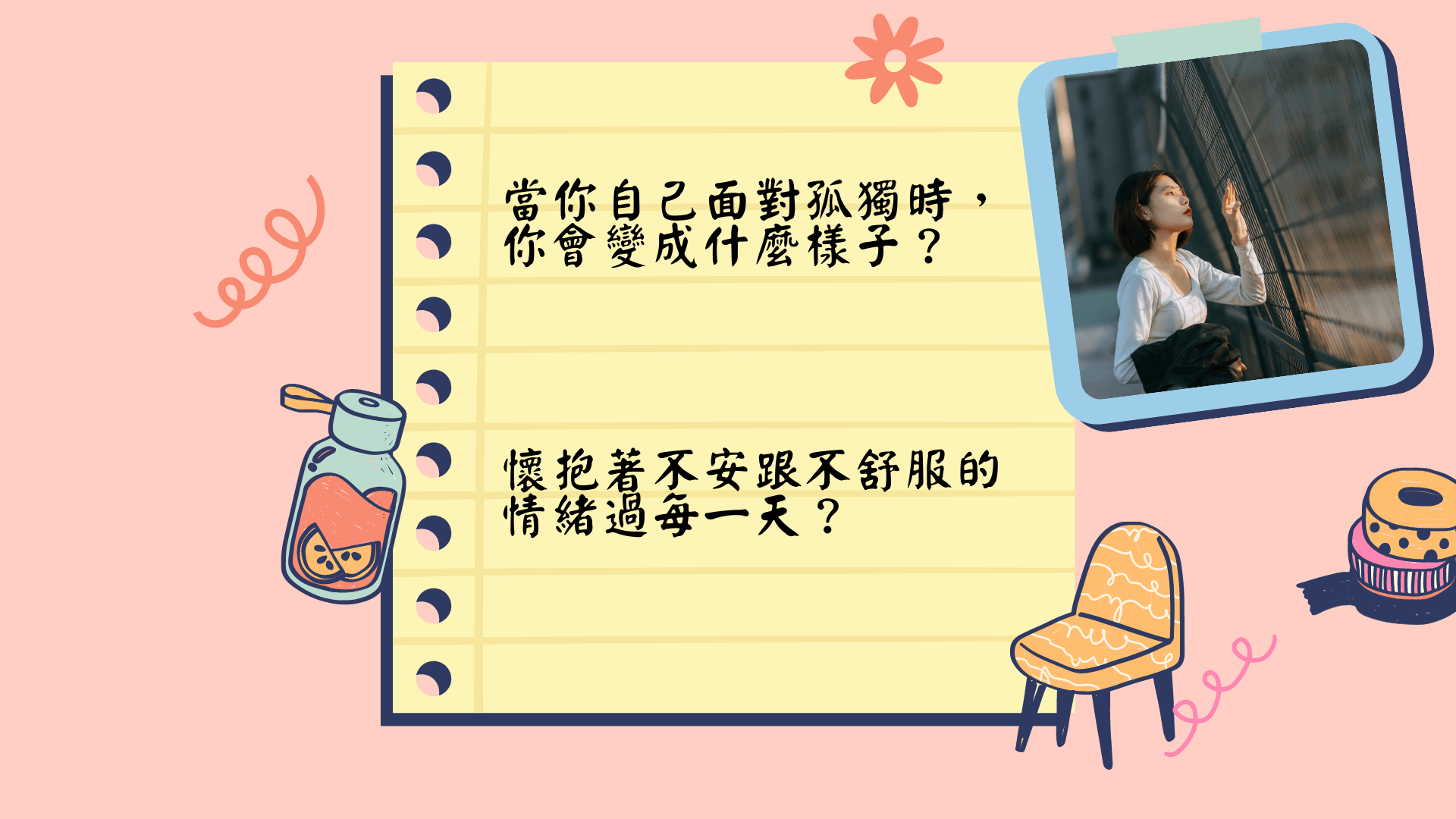 你的內在焦慮、空虛、失落或者無力感,在這種狀態中的你,或許還有好多感覺,是這些形容詞沒有辦法形容到的。