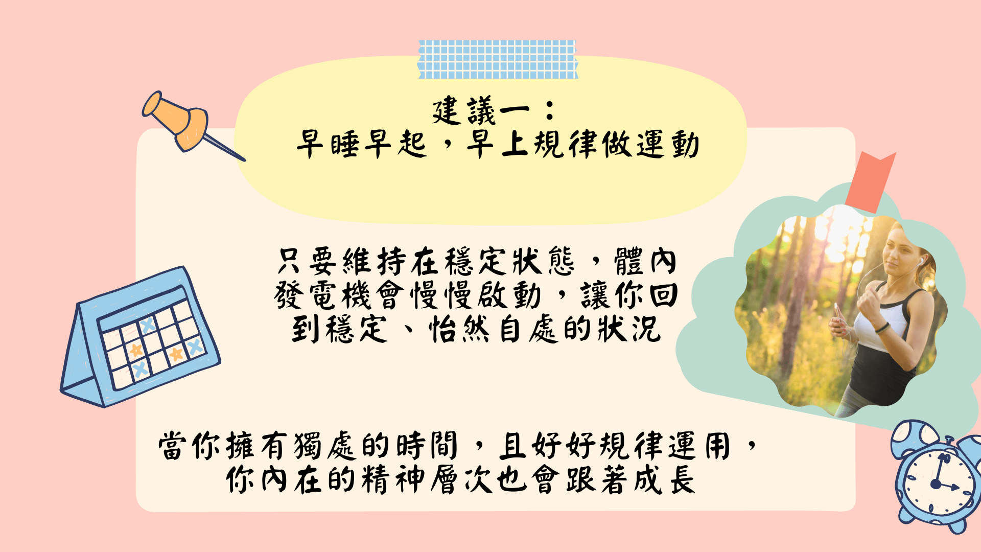 建議一:大家一定要記得早睡早起,早上要規律的做運動。