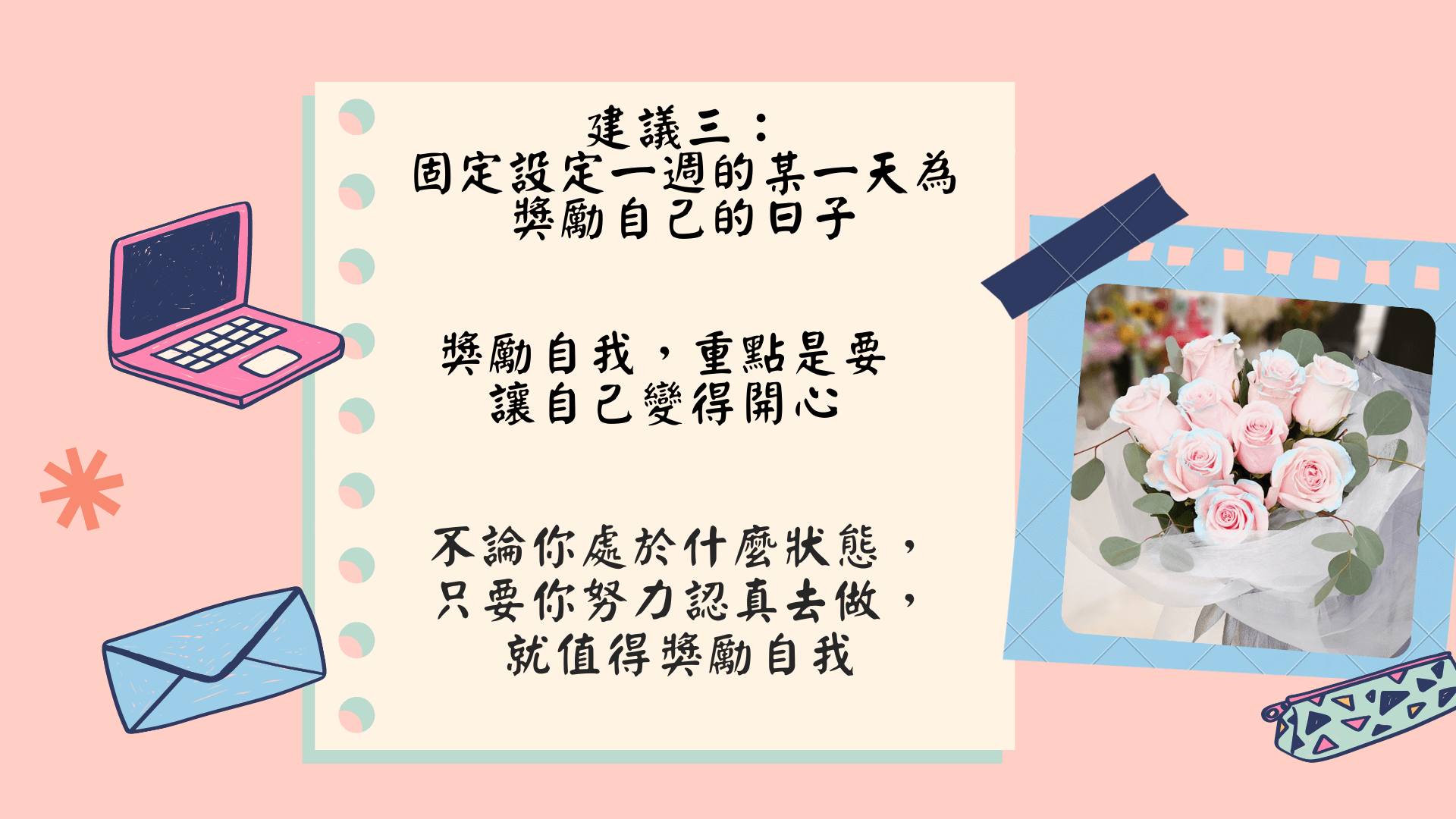 最後,作者建議大家,可以設定獎勵自己的一個方式,無論是在哪一天、哪種方式或方法,只要你懂得讓自己變得更開心一點,那就是善待自己。