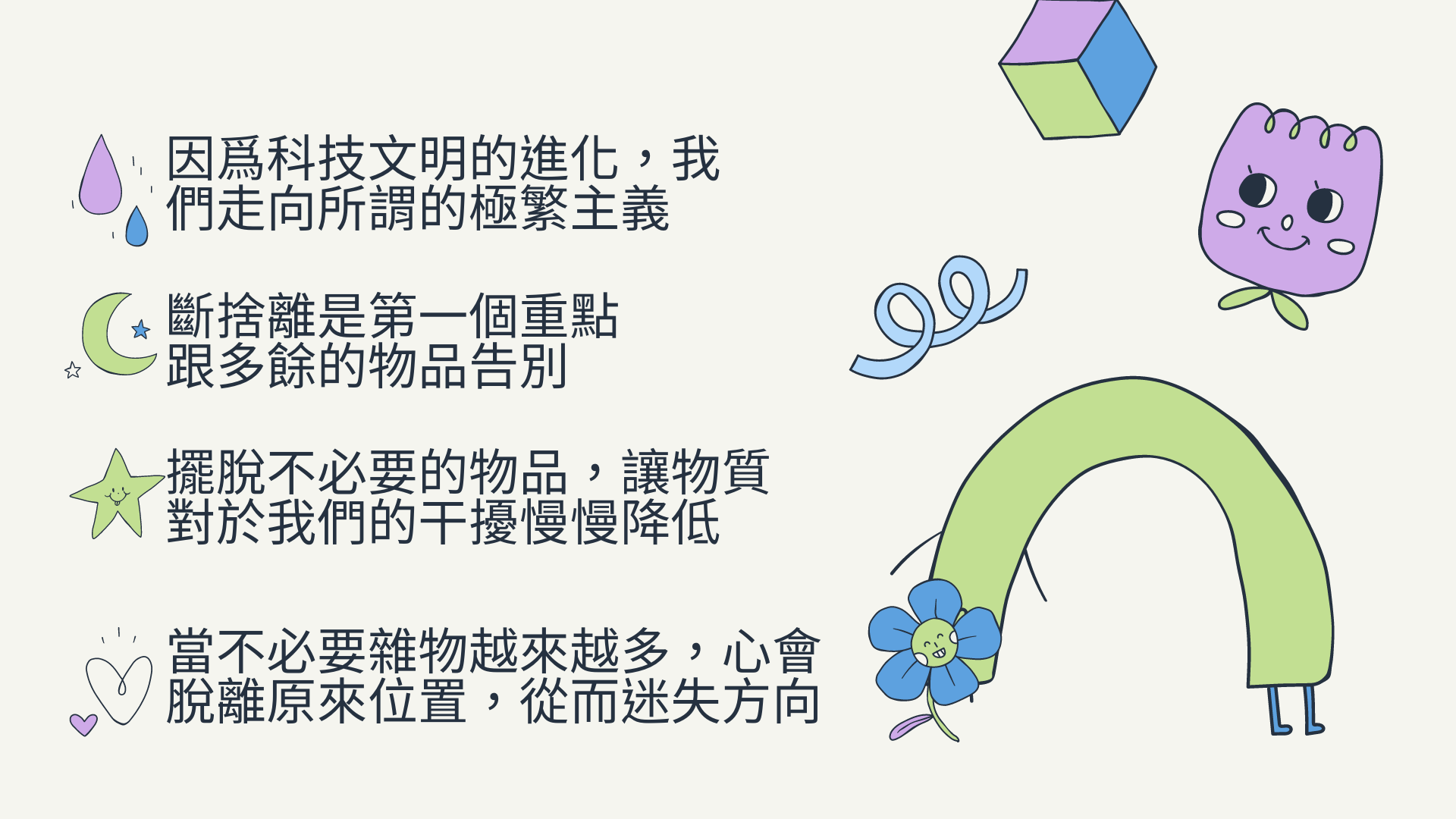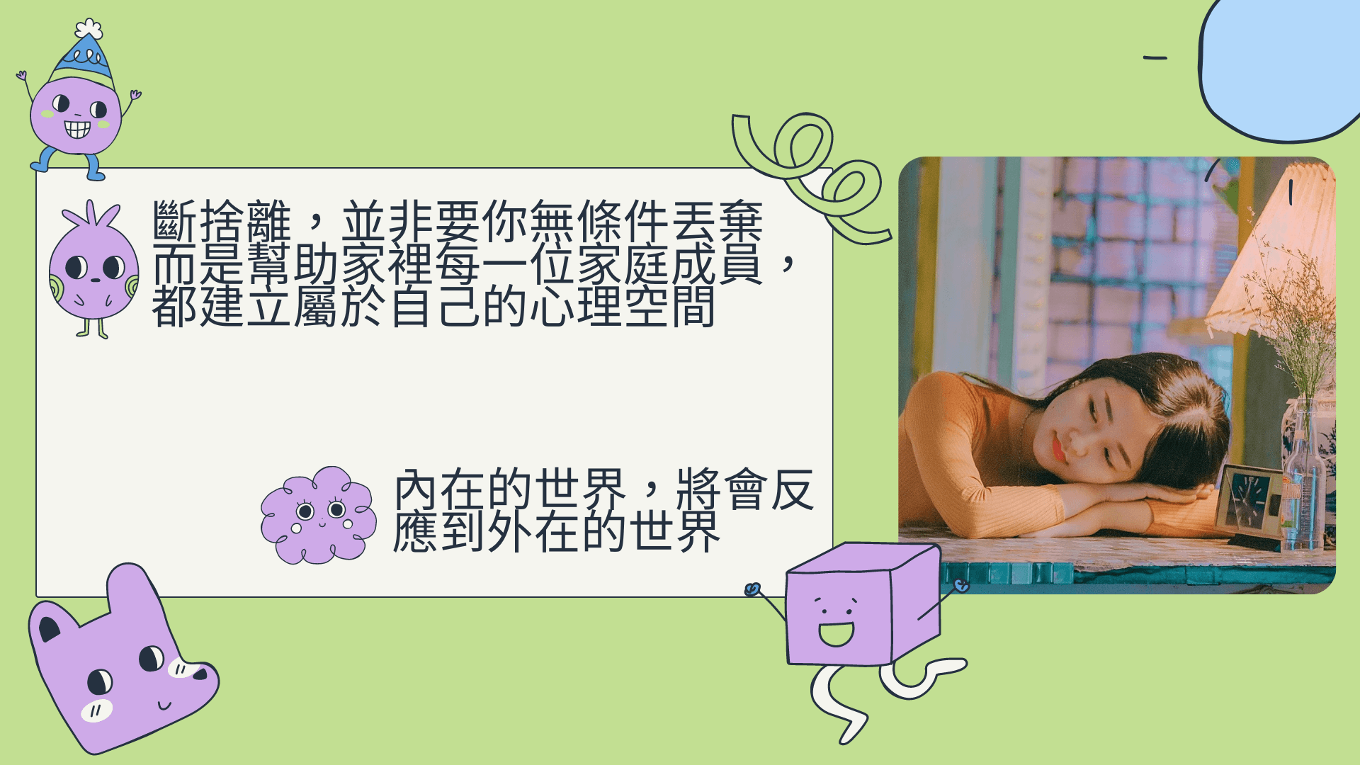 並不是教你要進行無條件的丟棄東西,而是幫助居住在這個空間的家庭成員,