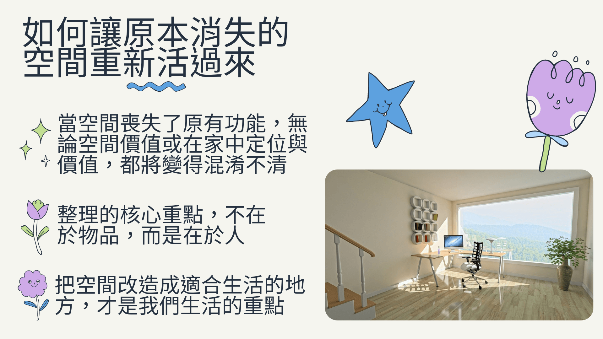 就是要跟大家好好分享,如何透過整理自己的空間,進而重新整理自己內在世界的實用技巧