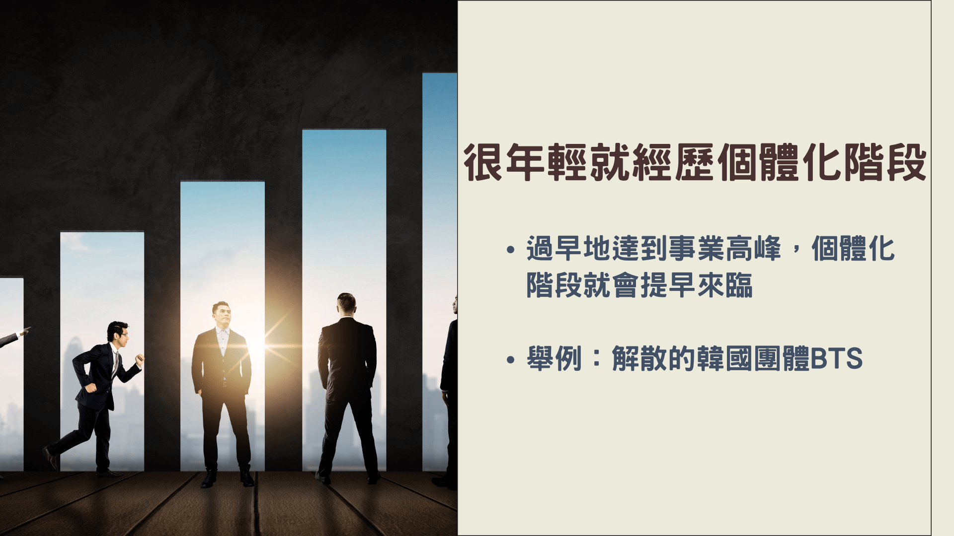 然後,就舉了一個前陣子說解散的韓國團體BTS,因為他們覺得,團員各自需要自己的時間,再去追尋他們想要的東西。他們的情況,可能就是過早地進入了所謂前半生的階段,在20幾歲時事業就達到高峰,在這個時候,對他們來講,可能個體化階段就會提早來臨。