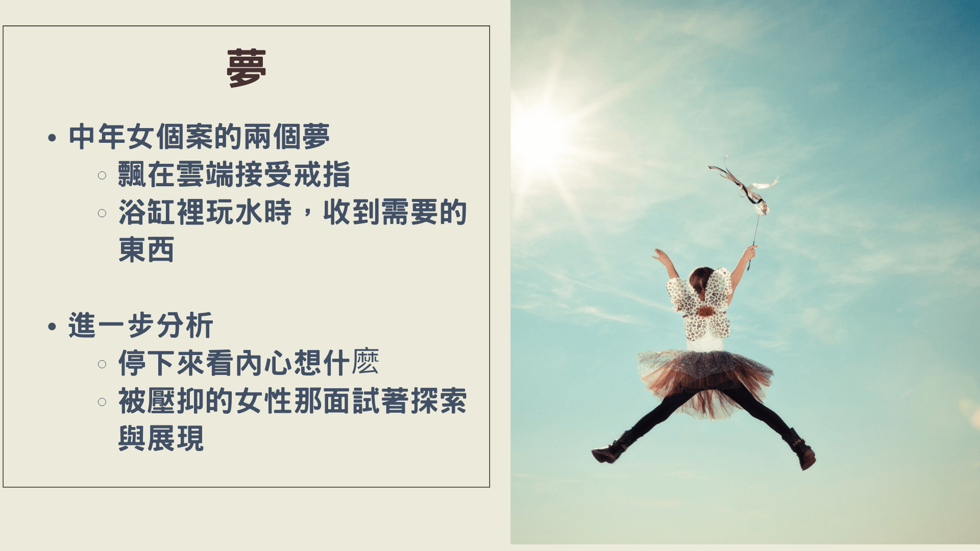 在書裡面,舉了一位女士的例子,我覺得還蠻淺顯的,可以跟聽眾讀者分享。它講的是,有一個來找他做分析的中年女個案,事業非常有成,沒有成家。她來了之後,想要了解自己,也許是遇見了瓶頸。
