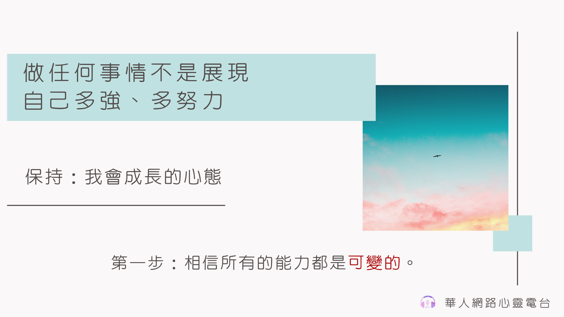 你做任何事情不是要展現自己多強、多努力,你是做任何一件事情要保持「我在這件事就會獲得成長,不管成功或失敗!」
