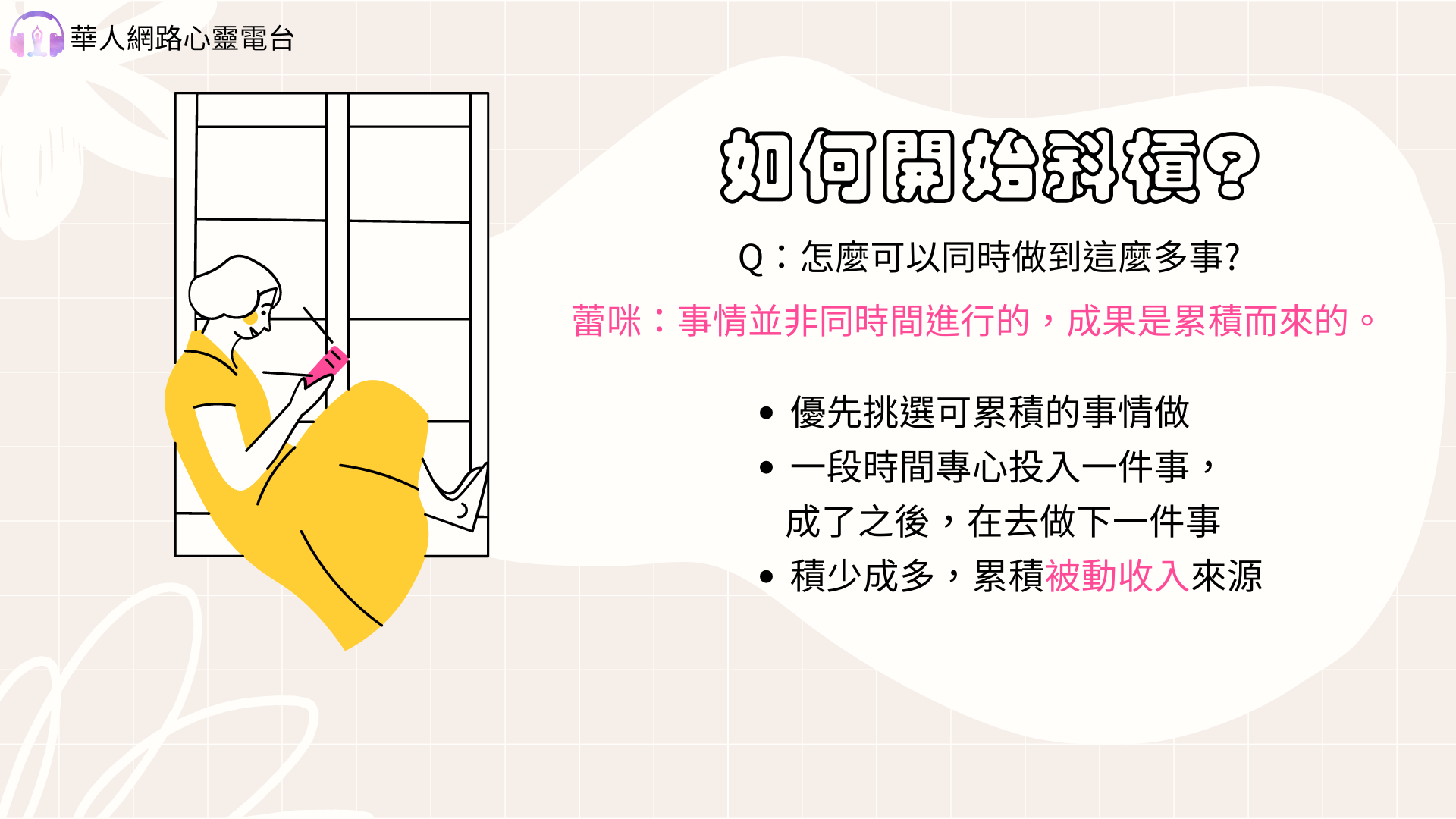 她可以斜槓很多很多能力,可不可以跟聽眾朋友來大概聊一下,怎麼有辦法可以這樣子斜槓?然後有很多時間?