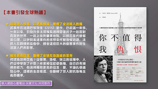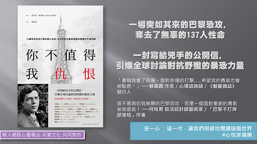 何謂恐攻的正義?從傷害、恐懼、哭泣的悲痛中,人們從中學到了什麼?作者相信即使經歷過傷痛,自己仍有撰擇的能力,他選擇擁抱更高的價值:愛,不讓仇恨進駐心中。這樣的生命態度,也翻轉了世人對抗恐怖主義的標準。