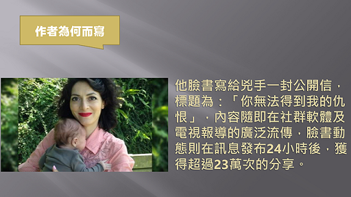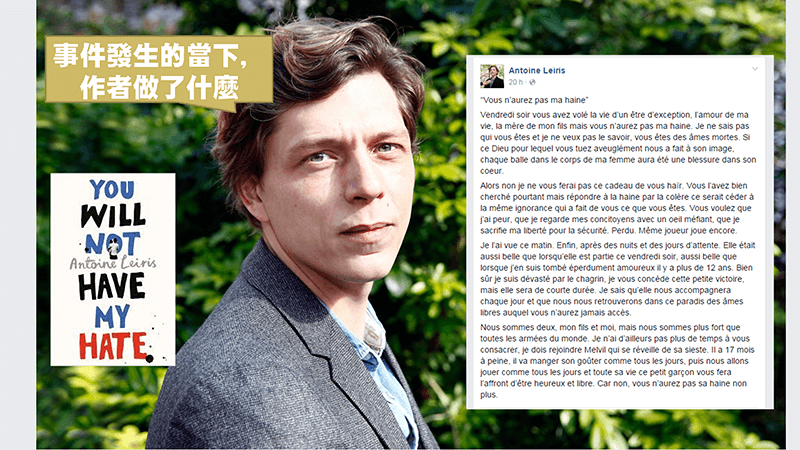 終於,在恐怖攻擊發生的這些天之後,今早我看到她了。她就跟上週五晚間出門時一樣漂亮,如同我十二年前瘋狂愛上她時一樣漂亮。當然,我飽嘗喪妻之痛,我把這份小小的勝利禮讓給你,但它不會持續太久。我知道她每天都陪著我們,將來還會在那個充滿自由靈魂的天堂與我們重逢,而那裡是你們永遠無法抵達的地方。我們只剩下兩個人,我兒子和我,但我們會比全世界的軍隊都更堅強。我沒有時間浪費在你們身上,我得回去找馬維爾了,他剛睡完午覺起床。他只有十七個月大。他會像之前一樣,每天吃著點心,我們也會繼續每天玩耍。這個小男孩終其一生都將對抗你們,因為他會照常快樂而自由的長大。因為,不會的,你們也無法得到他的仇恨。