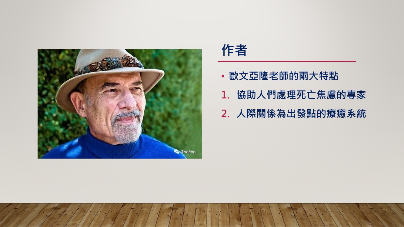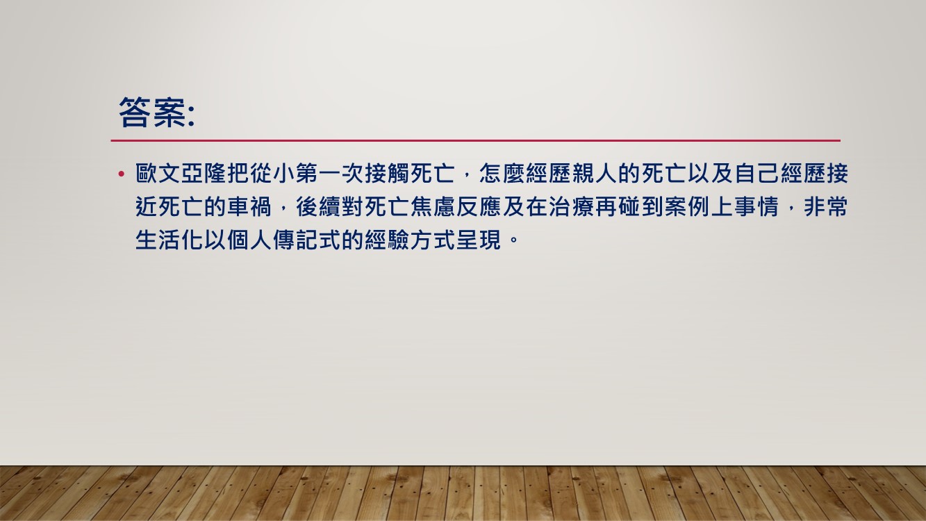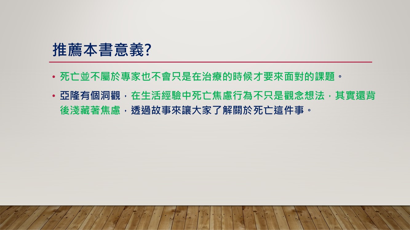 蔡:看這本書直接看跟自己生活經驗去對話就可以,去發現這方面的內涵書裡有一章是歐文亞隆把自己從小第一次接觸死亡,怎麼樣經歷的身邊親人的死亡,自己曾經經歷過一次接近死亡的車禍,後續對死亡焦慮反應及在治療再碰到案例上事情,非常生活化以個人傳記式的經驗方式呈現,沒有太多專業的門檻很庶民化的一本書。