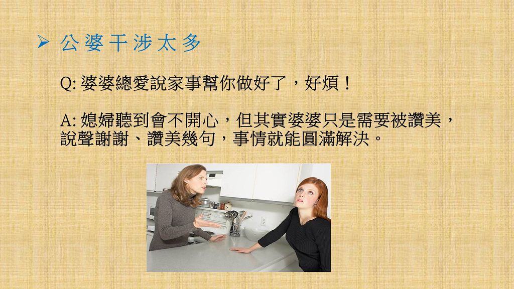 如果是我就會問:「今後你想怎麼做?」面對有婆媳問題困擾的人,不該請她述說長年累積的怨懟,假如想要與婆婆建立良好的關係(或許會這樣問的人並不多……),或是想要減低對於婆婆的不愉快記憶,為了讓她達到那樣的生活,我會將今後如何與婆婆相處才能平穩地度過人生,以及該怎麼做才不會痛苦等一併思考,積極地提供建議。