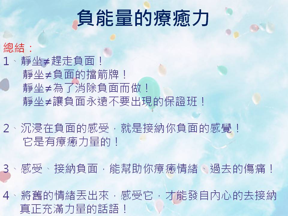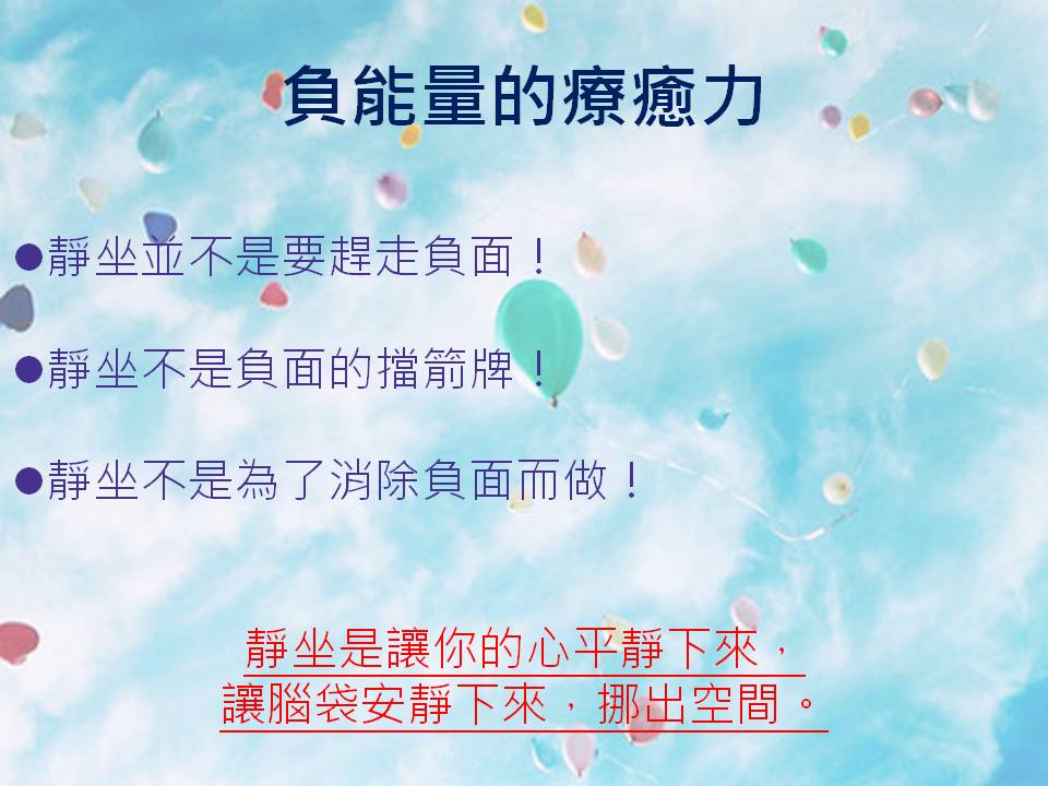 我知道我不能再抱著為了要平靜,消除這個負面而靜坐了,因為這就有點像是你在負面的狀態中,你卻要求自己要正面,要快樂,要想正面的事情,那是壓抑、抗拒、不接納的狀態!