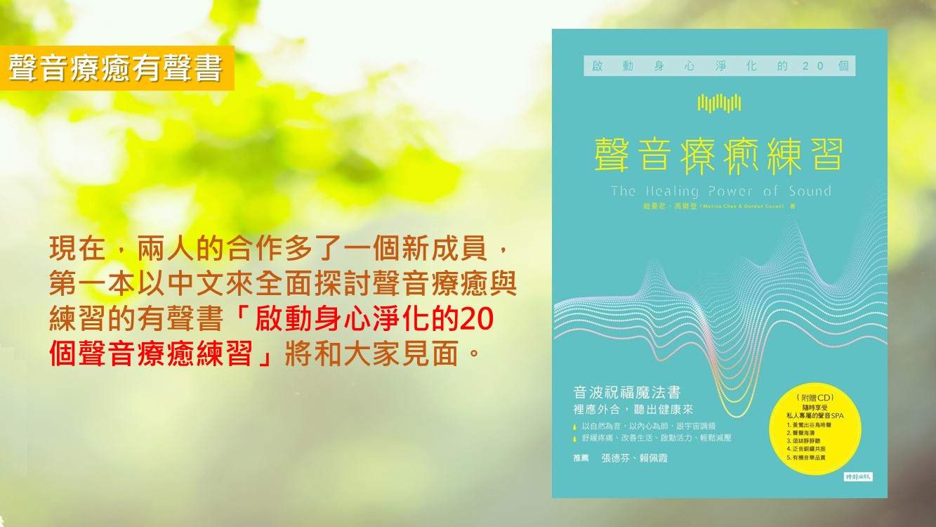 音波祝福會客室快滿一週年了。在這一年內,除了網路網播、Youtube影片之外,音波祝福一直想把好聲音、大自然的有機音樂,透過網路,傳給大眾。現在,兩人的合作多了一個新成員,第一本以中文來全面探討聲音療癒與練習的有聲書「啟動身心淨化的20個聲音療癒練習」將和大家見面。