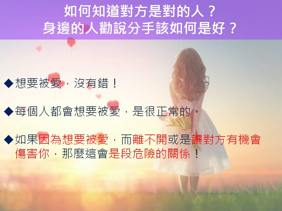 但如果是因為想要被愛,而離不開或是讓對方有機會傷害你,那麼這就會是段危險的關係!