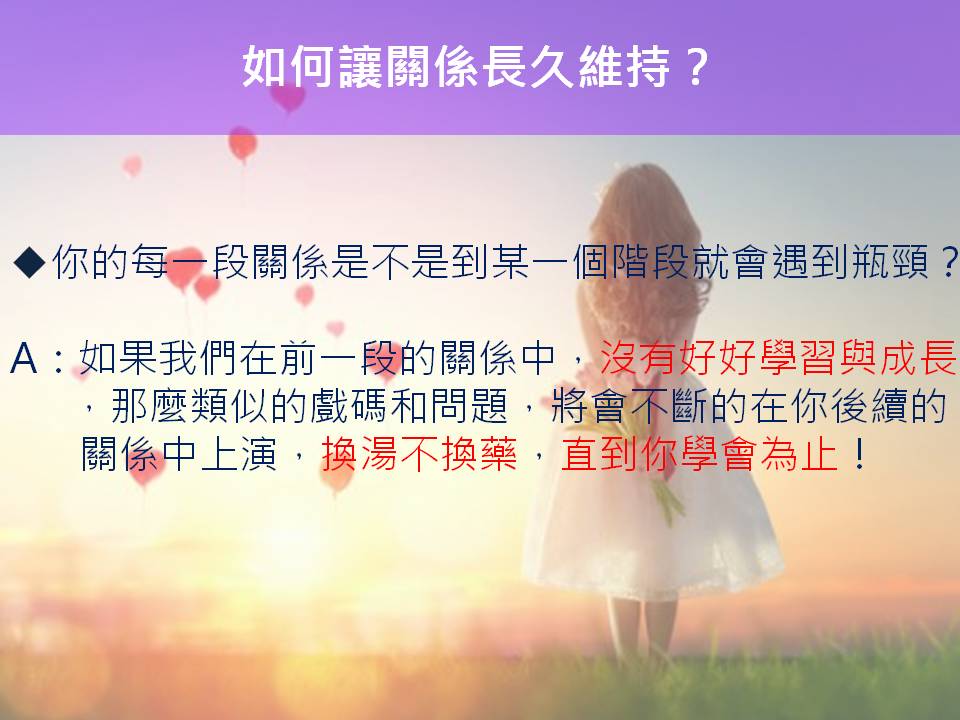 如果我們在前一段的關係中,沒有好好學習與成長,那麼類似的戲碼和問題,將會不斷的在你後續的關係中上演,換湯不換藥,直到你學會為止!