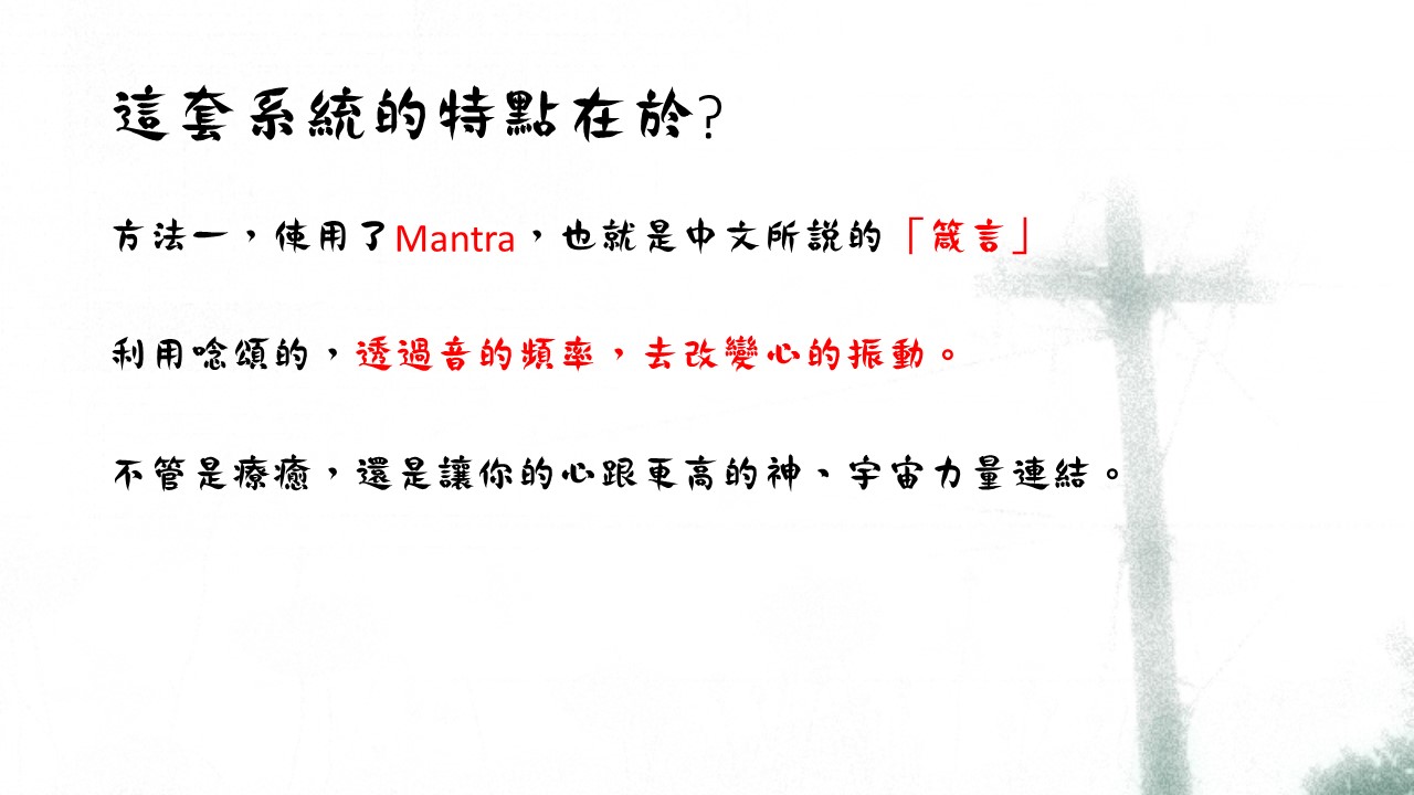 他們的方法有點類似mantra,就是中文說的「箴言」,你要用唸頌的,透過音的頻率,去改變心的振動。不管是療癒,還是讓你的心跟更高的神、宇宙力量連結。