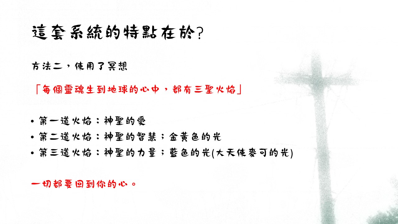 第二個方法是,他們會做一些冥想,神秘士說:「每個靈魂生到地球的心中,都有三聖火焰」;三捲神聖的火焰。