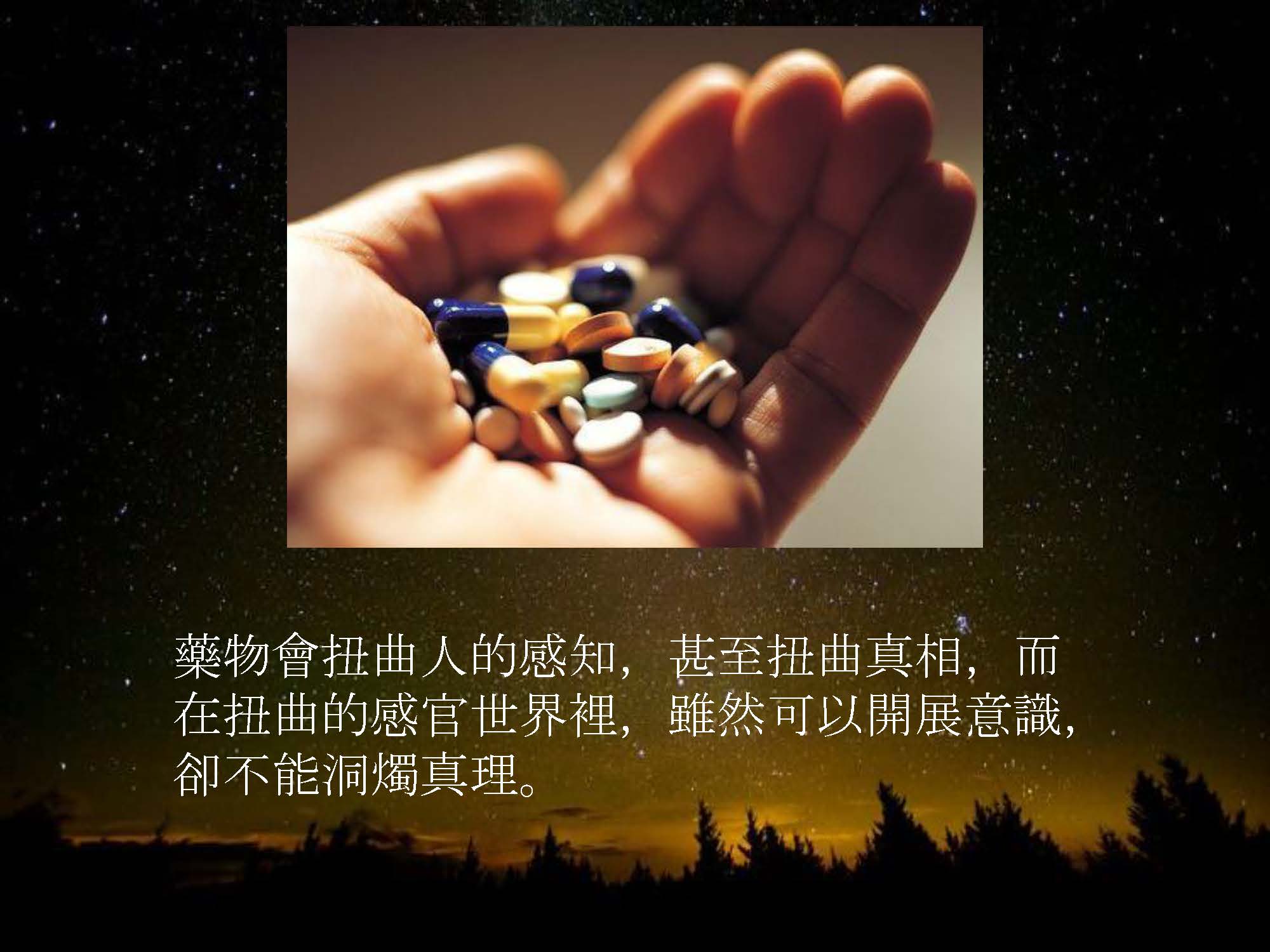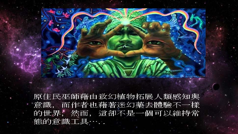 Sada:書中提到為了體驗更高層次有人會嗑藥,以前的人為了實驗人類意識可擴張到什麼時候,但這對意識擴張幫助不是很好,之前做般尼克個案時遇過嗑過死藤水的