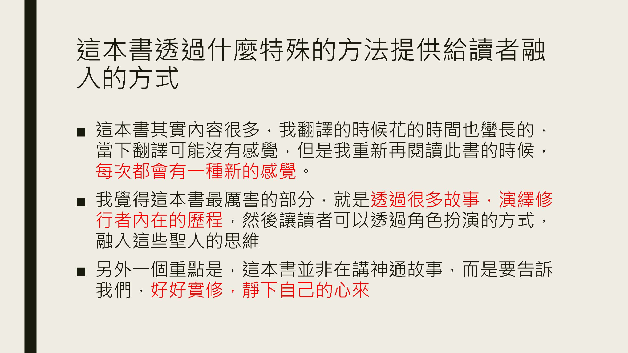 我覺得這本書最厲害的部分,就是透過很多故事,演繹修行者內在的歷程,然後讓讀者可以透過角色扮演的方式,融入這些聖人的思維
